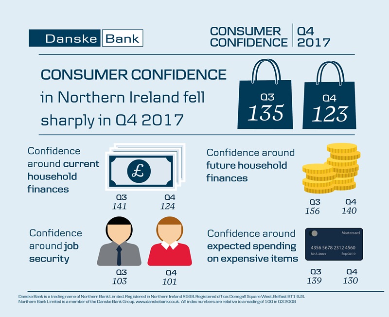 The Danske Bank Northern Ireland Consumer Confidence Index registered a reading of 123 in the fourth quarter of 2017. This was significantly below the 135 registered in the third quarter of 2017 and the 132 reading in the fourth quarter of 2016.