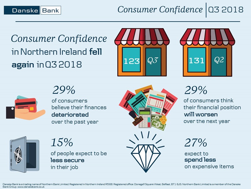 Consumer confidence in Northern Ireland fell again in the third quarter of 2018, weighed down by concerns over the absence of a functioning Executive, Brexit and high inflation.