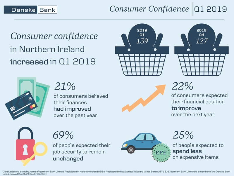The Danske Bank Northern Ireland Consumer Confidence Index rose to 139 in Q1 2019, up from 127 in the fourth quarter of last year but below the 142 registered in the first quarter of 2018.