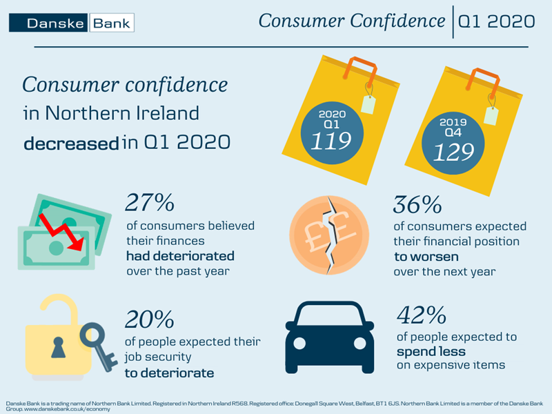 The Danske Bank Northern Ireland Consumer Confidence Index fell to 119 in Q1 2020, down from 129 in the fourth quarter of last year and significantly below the reading of 139 posted in the first quarter of 2019. The Q1 2020 index reading was the lowest since 2013.