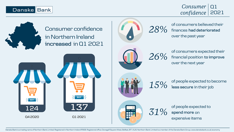 The Danske Bank Northern Ireland Consumer Confidence Index increased to 137 in 2021 Q1, up from 124 in the fourth quarter of 2020, and above the reading of 119 posted in the first quarter of last year. The survey was carried out in March 2021.