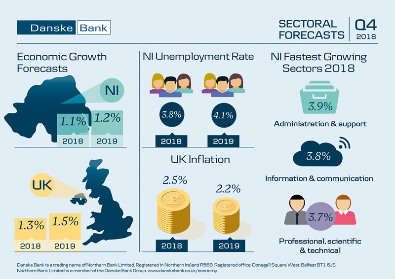 The Northern Ireland economy has continued to benefit from strong jobs growth and we estimate that employment growth will reach 1.9% for the whole of 2018. However, jobs growth is expected to slow to 0.5% in 2019 as momentum begins to cool due to the little spare capacity left in the labour market and firms instead have to focus on increasing productivity.