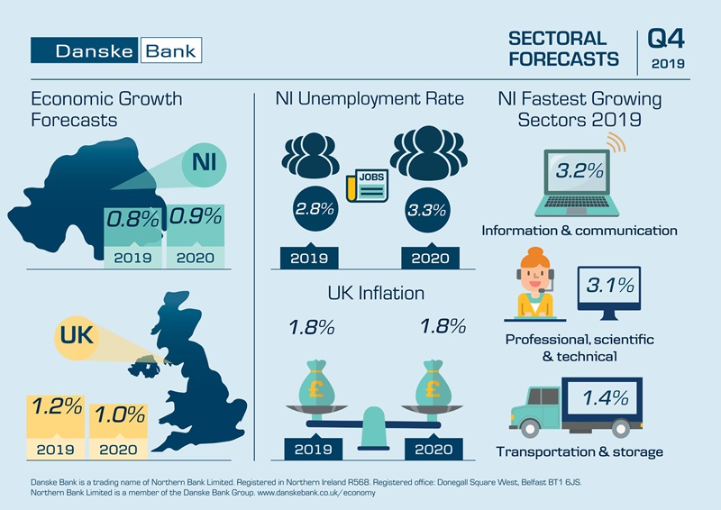 Throughout 2020, the economy is expected to continue relying on consumer spending to drive growth as uncertainty around the future trading relationship between the UK and the EU weighs on business investment and modest global growth constrains exports. We estimate that economic growth in Northern Ireland was a subdued 0.8 per cent in 2019, with the rate of expansion in 2020 forecast to rise just slightly to 0.9 per cent.