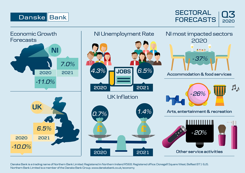 The Northern Ireland economy experienced a sharp contraction in the first half of 2020 due to the coronavirus pandemic. A gradual return of economic activity now looks to be underway but the recent rise in the number of Covid-19 cases and the need for new restrictions demonstrates the fragility of the recovery. Plus with the end of the Brexit transition period also rapidly approaching, there is a great deal of uncertainty and risk to the outlook. We are continuing to forecast that the Northern Ireland economy will contract by around 11% in 2020 and then grow by about 7% in 2021.