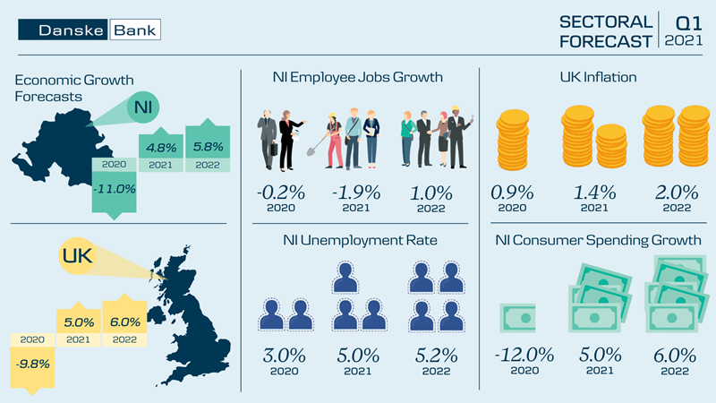 The coronavirus restrictions in place throughout the first quarter of this year are likely to lead to a contraction in economic activity in that period. However, the fall in coronavirus case numbers and the successful rollout of the vaccine programme are expected to lead to the gradual easing of the restrictions throughout 2021 with the local economy returning to positive rates of growth from the second quarter onwards. Economic policy measures are also expected to support people and businesses as the economy begins to recover from the impacts of the pandemic. Against this backdrop, we have upgraded our forecasts for economic growth in Northern Ireland this year and now expect the local economy to expand by around 4.8% in 2021, with growth of about 5.8% projected for 2022.