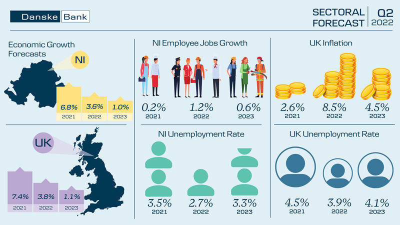 The Northern Ireland economy is estimated to have grown again in the first quarter of 2022 but the pace of economic growth is likely to slow from the second quarter of the year onwards. Inflation is at a multi-decade high as the war in Ukraine and global supply chain issues are contributing to higher prices and consumer spending is becoming increasingly squeezed. The economic policy environment is also less supportive of growth and uncertainty levels are particularly elevated. We continue to expect the Northern Ireland economy to grow by around 3.6% in 2022, but have downgraded our forecast for 2023 and now expect economic output to expand by about 1.0% next year.