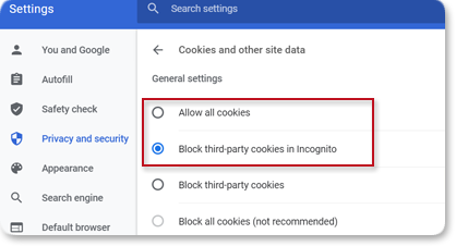 Choose 'Allow all cookies' or 'Block third-party cookies in Incognito'