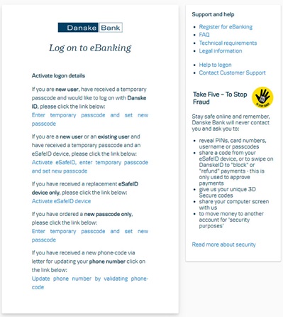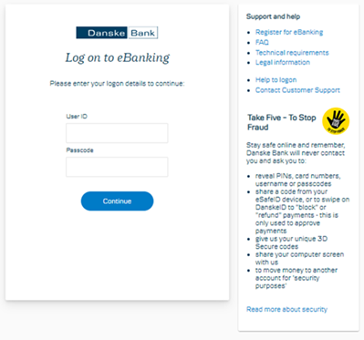 Step 2: Enter your 8 digit user ID and enter the 4 digit temporary passcode into the ‘Passcode’ field. Click Continue. You will be redirected to the following screen, where you should select the top link for Danske ID: